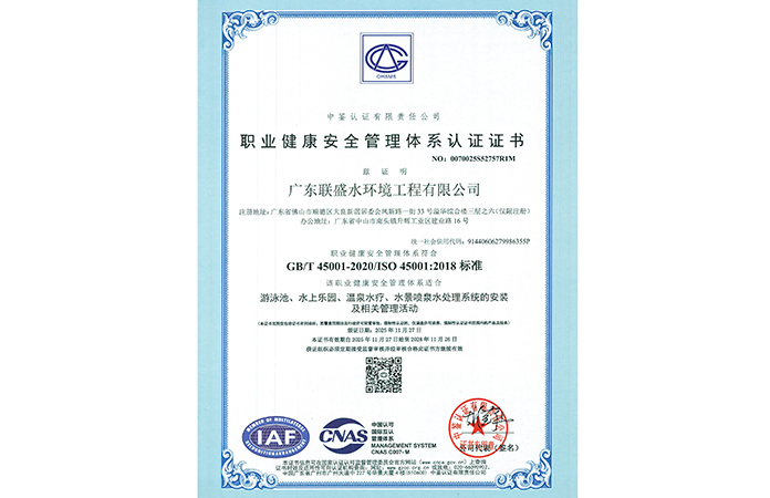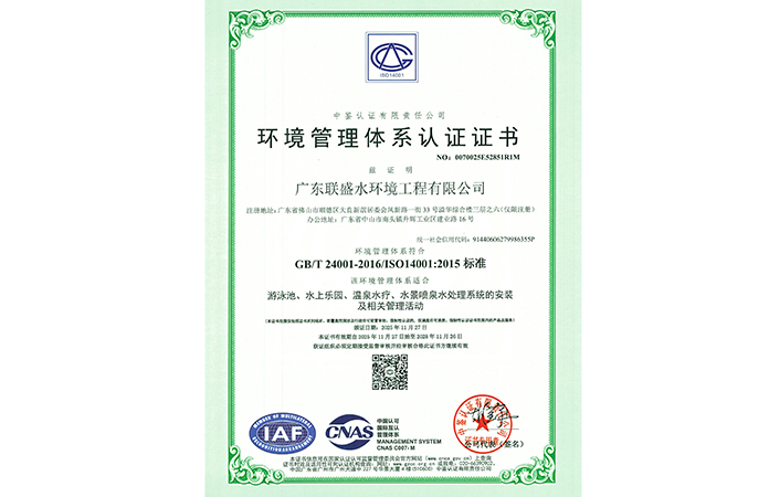 水上游乐设施、喷泉水景、水疗设施、水处理、游泳池设计、制造甲级证书