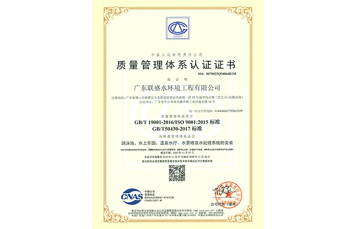 水上游乐设施、喷泉水景、水疗设施、水处理、游泳池设计、制造甲级证书